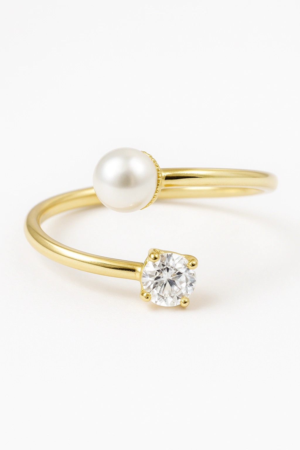 Anel solitário ajustável folheado a ouro com pérola de 6 mm e zircônia