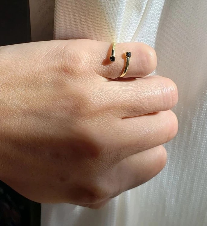 Anel de falange ou infantil ajustável folheado a ouro com duas pedrinhas de strass nas extremidades