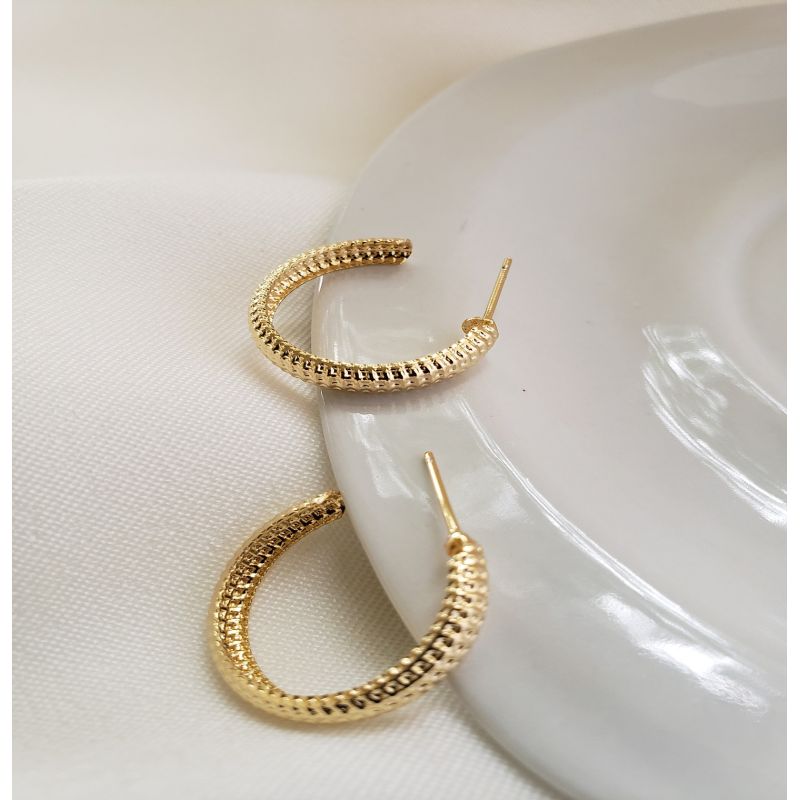 Brinco de argola folheado a ouro, feito com chapa abaulada contendo estampas onduladas