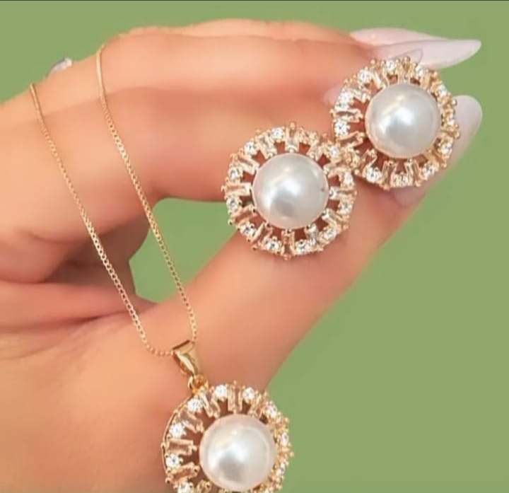 Conjunto de pérola com colar, brinco e pingente, perfeito para quem busca elegância e sofisticação em cada detalhe. As pérolas trazem um toque clássico que combina com qualquer ocasião, do dia a dia a eventos especiais. Para manter o brilho e a durabilidade, evite contato com perfumes, cremes e umidade, guardando sempre em local seco e separado de outras peças